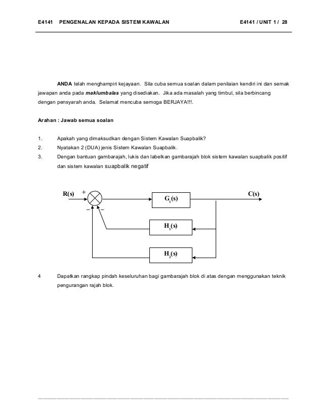 Dec 10 2013 E4141 PENGENALAN KEPADA SISTEM KAWALAN E4141 UNIT 1 19 _____ INPUT 17 KAWALAN PROSES GELUNG TERBUKA DAN GELUNG TERTUTUP Pengkajian yang dilakukan di dalam bidang kejuruteraan kawalan membolehkan sistem kawalan diklasifikasikan kepada dua. Litar sistem pusat terbuka Litar sistem pusat tertutup 61 Litar Sistem Pusat Terbuka Dalam litar sistem pusat terbuka pam akan bergerak berterusan walaupun injap kawalan berarah berada dalam kedudukan neutral. Kawalan elektrik ialah komponen yang mengawal atau melaras kerja alatan elektrik berdasarkan aturan kerja yang telah ditentukan terlebih dahulu.